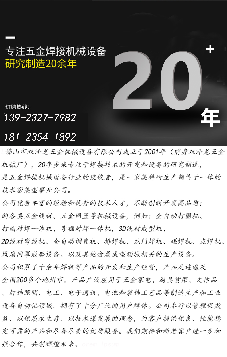 佛山市双泽龙五金机械设备有限公司位于广东佛山市顺德区北滘镇,主营:点焊机、排焊机、碰焊机,龙门焊机、打圈机、压扁机、螺旋绕线机等及风扇网罩,金属网类成套生产设备。
